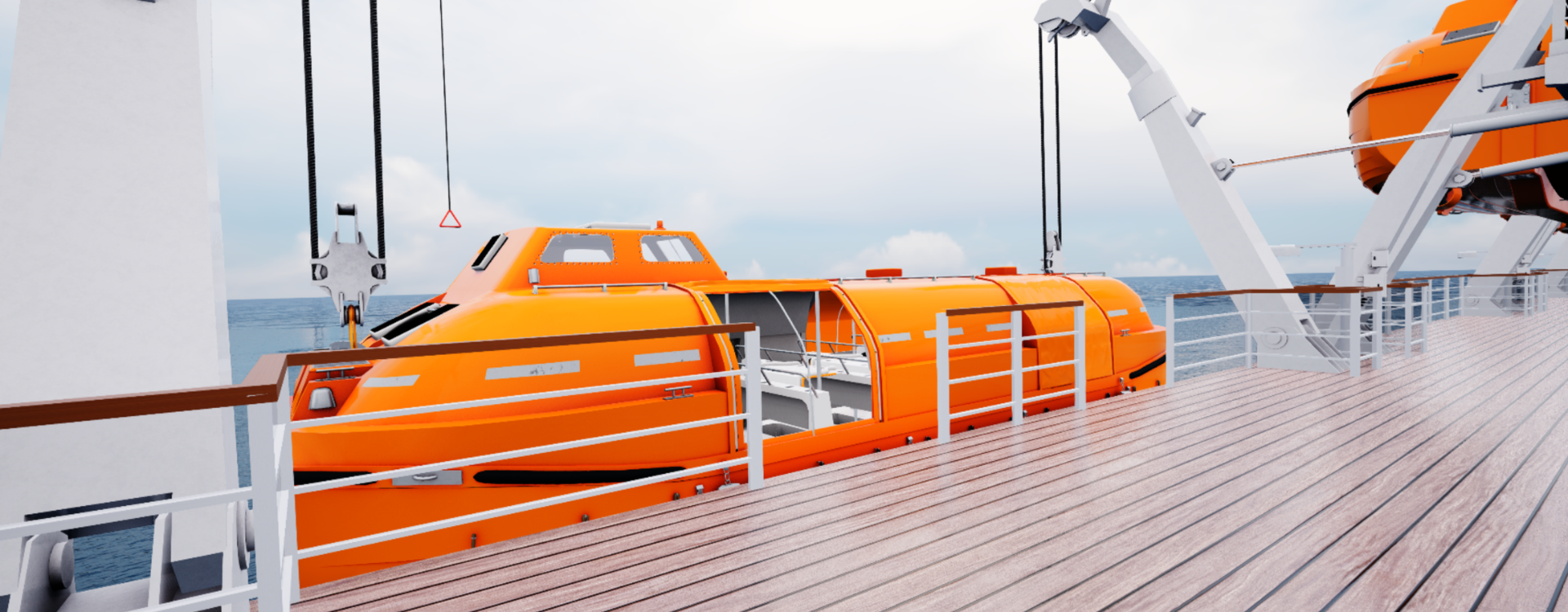 • Familiarization – get to know the lifeboat and davit system, learn how to use the VR equipment, and gain an understanding of how the simulator is structured.